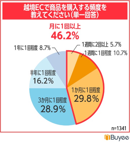 越境ECでの購入頻度は46.2%が「1か月に1回以上」と回答。91.3%が1年に2回以上利用