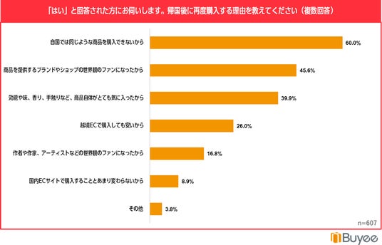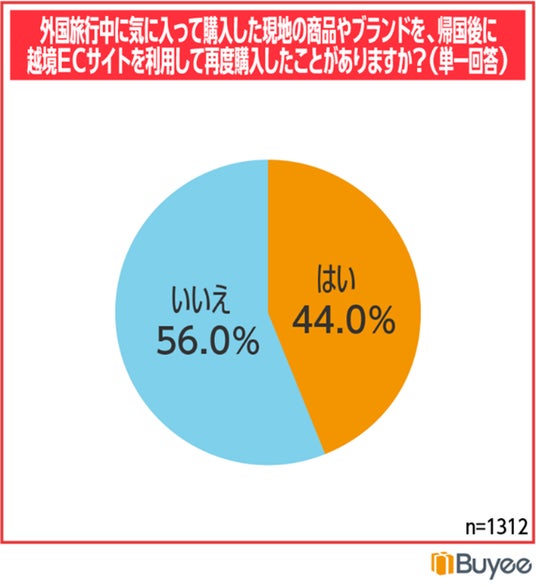 ・旅行中に購入した現地の商品やブランドを、帰国後に越境ECを利用して再度購入した経験者は44.0%。旅アト消費の理由は「自国で買えないから」「ブランドやショップ、商品のファンになったから」
