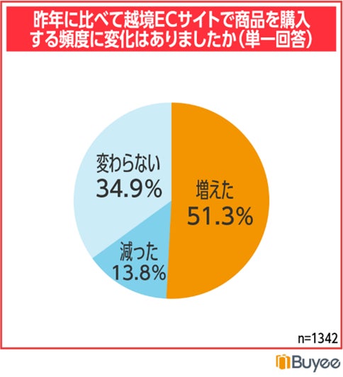 ・1回あたりの購入金額は「5,000円~1万円未満」が最多。51.3%が2023年に比べて2024年に越境ECの利用頻度が増加