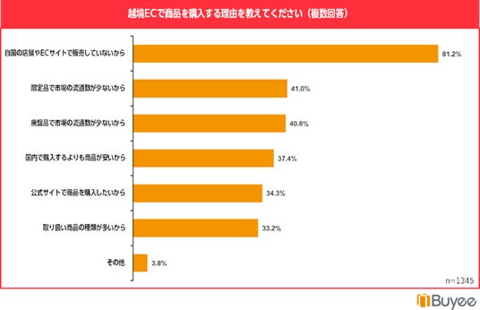 越境ECを利用する理由は「自国の店舗やECサイトで販売していないから」が81.2%と突出。「限定品」「廃盤品」「国内よりも安い」「公式品」「種類の多さ」なども30%超の結果に