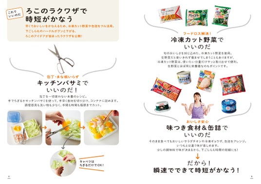 冷凍コンテナごはんは(1)食材を詰める(2)冷凍する(3)レンチンするの3ステップだから簡単に作って食べられます。実際の下ごしらえ時間はわずか1~3分ほど。ろこ史上最速レシピは包丁もまな板も使わず、食材を切るときはキッチンバサミで切るか、手でちぎります。味付き食材や缶詰などのクイック食材を使うことで調理工程や洗い物の手間を徹底的に省きました。究極の時短で手間なしだから食材が余ったときや夜ごはん作りのついでにパパっと作れます。
