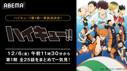 新しい未来のテレビ「ABEMA」は、アニメ「ハイキュー!!」シリーズより、第1期全25話を、12月6日(金)に無料一挙放送いたします。