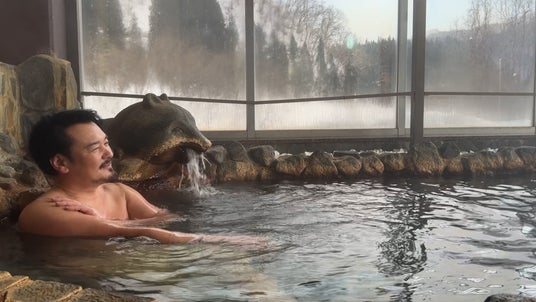 そうこうしている間に、到着したのは、伊勢堂岱温泉・縄文の湯。地下1200メートルから湧く、源泉掛け流しの温泉は、雪で冷え切った体を芯から温める、ハード設定の温度。「熱っ!めちゃめちゃ熱いんよ」。なかなか肩まで浸かれない小田井。さらに、湯内の撮影を買って出るも、信じられない大ボケも。礼二からもツッコミが入る。