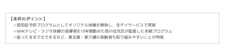 ヒューマンホールディングス株式会社の事業子会社で介護事業等を展開するヒューマンライフケア株式会社(本社:東京都新宿区、代表取締役:瀬戸口信也、以下「当社」)は、現在取り組んでいる認知症予防プログラムの強化に向けたオリジナルの体操「ヒューマン体操」を開発し、1月17日から直営の全デイサービス事業所で順次開始します。NHKテレビ・ラジオ体操の指導者を15年間務めた西川佳克氏が監修し、座ったままでもできるなど要支援・要介護の高齢者も取り組みやすいことが特長です。早期からの適切なアプローチで認知症予防につなげ、利用者の自立支援を図ってまいります。