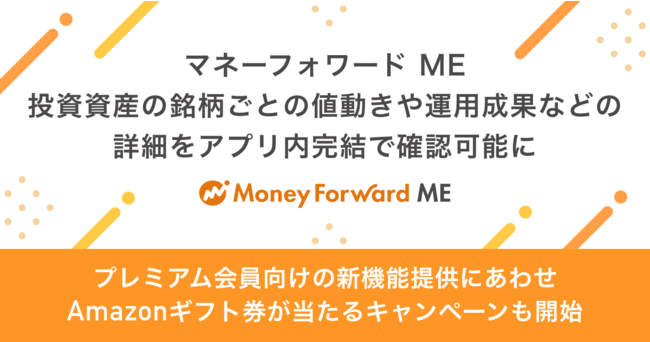 株式会社マネーフォワードは、お金の見える化サービス『マネーフォワード ME』のアプリにて投資資産の銘柄ごとの詳細情報が確認できるプレミアム会員向けの新機能(以下「本機能」)の提供を順次開始します。また本機能のリリースにあわせて、プレミアムサービスへ登録いただいた方を対象に、抽選でAmazonギフト券が当たるキャンペーンを実施いたします。
