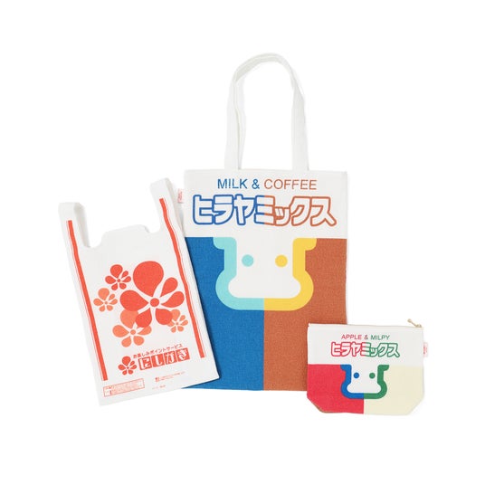 地元密着型のローカルスーパー〈にしがき〉や地域住民に長く親しまれている牛乳〈ヒラヤミルク〉のパッケージデザインをモチーフにしたアイテムは、ポリエステル100%の生地を使用している