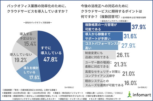 会社のバックオフィス担当者を対象に、バックオフィス業務の効率化のためのクラウドサービス導入について尋ねたところ(n=506)、約7割が「すでに導入している(47.8%)」「導入を検討している(17.6%)」と回答しました。