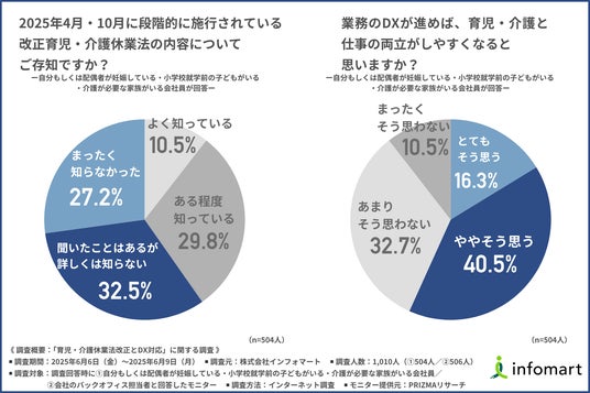 デジタルの力であらゆる業務を効率化する株式会社インフォマート(本社:東京都港区 代表取締役社長:中島 健、以下「当社」)は、自分もしくは配偶者が妊娠している、小学校就学前の子どもがいる、介護が必要な家族がいる会社員504名と、会社のバックオフィス担当者506名を対象に、育児・介護休業法改正とDX対応に関する調査を実施しましたので、その結果をお知らせします。