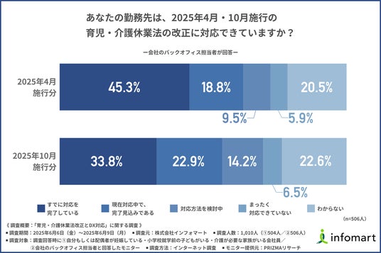 会社のバックオフィス担当者を対象に、勤務先の、2025年4月・10月施行の育児・介護休業法の改正への対応状況を聞いたところ(n=506)、段階的に進む法改正への対応は、4月施行分は半数近くが「すでに対応を完了している」と回答したものの、10月施行分は約3割にとどまっており、対応が追いついていない企業も多い実態が見て取れます。