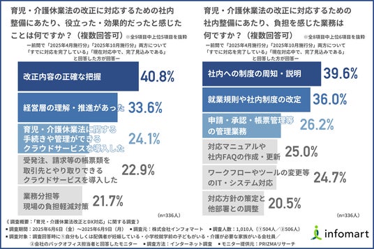 前問で「2025年4月施行分」「2025年10月施行分」両方について「すでに対応を完了している」「現在対応中で、完了見込みである」と回答した方を対象に、育児・介護休業法の改正に対応するための社内整備にあたり、役立った・効果的だったと感じたことについて尋ねたところ(n=336)、「改正内容の正確な把握(40.8%)」「経営層の理解・推進があった(33.6%)」「育児・介護休業法に関する手続きや管理ができるクラウドサービスを導入した(24.1%)」等が上位に挙がりました。