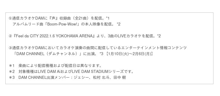 通信カラオケDAMでは、ファン待望のニューアルバム『声』収録曲の全21曲を配信、さらにアルバムリード曲の「Boom-Pow-Wow!」の本人映像を配信します。また、2022年1月に開催したライブ『Feel da CITY 2022.1.6 YOKOHAMA ARENA』より、選りすぐりの3曲をLIVEカラオケで配信します。