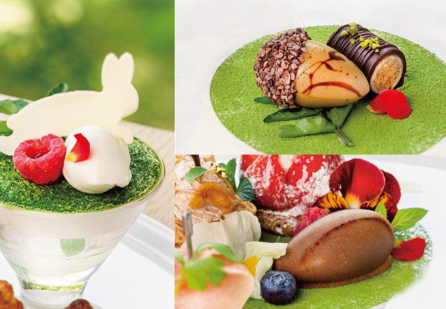 緑の苔庭にうさぎが跳ねるチーズデザート「クレームマスカルポーネシトロン」。リスのお目当て、木の実をかたどった「どんぐりボンボンショコラ」。小鳥たちの巣をイメージした信州りんごの「カダイフシュークリーム」。当店を象徴するイノシシの姿でしぼった“うり坊モンブラン”。