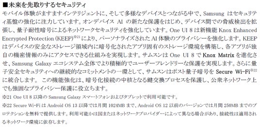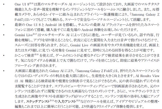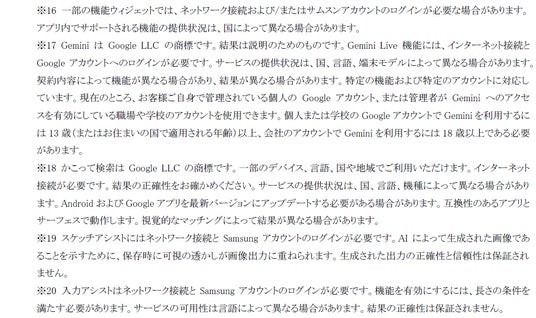 ※15 特定の AI 機能を使用するには、Samsungアカウントのログインが必要な場合があります。サムスンはAI機能によって提供される出力の正確性、完全性、信頼性について、いかなる約束、保証も行いません。Galaxy AI機能の利用可否は地域/国、OS/One UIのバージョン、モデル、販売先によって異なる場合があります。