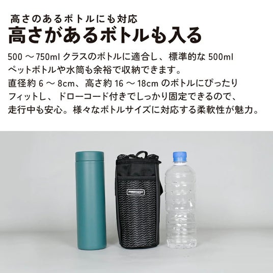 直径約6~8cm、高さ約16~18cm(一般的な500~750mlのペットボトルやサイクリングボトルに適合)