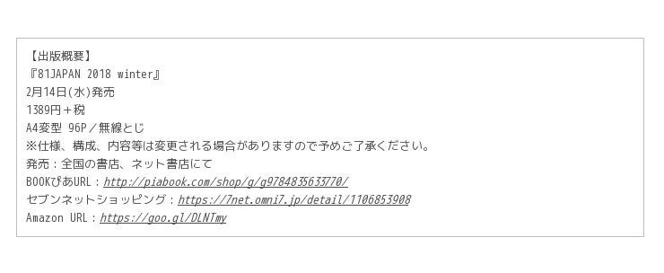 2月14日、世界とつながるカルチャーマガジン『81JAPAN 2018 winter』が、ぴあより発売となりました。