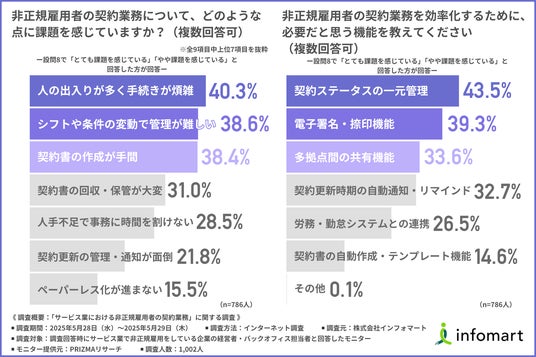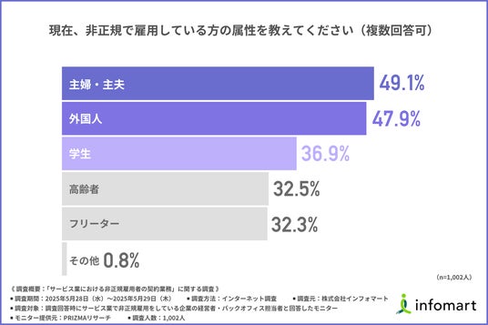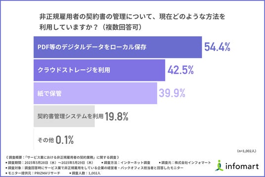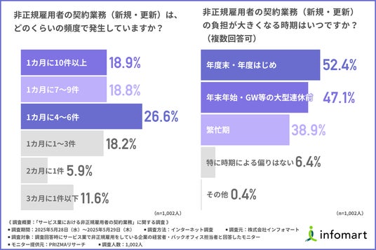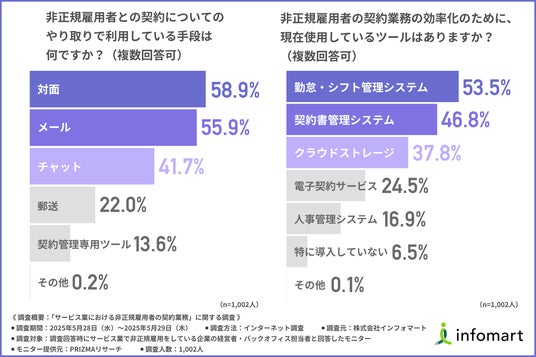 デジタルの力であらゆる業務を効率化する株式会社インフォマート(本社:東京都港区 代表取締役社長:中島 健、以下「当社」)は、サービス業で非正規雇用をしている企業の経営者・バックオフィス担当者1,002名を対象に、「サービス業における非正規雇用者の契約業務」に関する調査を実施しましたので、その結果をお知らせします。