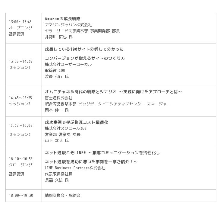 そのほか、「成長している100サイト分析して分かったコンバージョンが増えるサイトの作り方」(株式会社ユーザーローカル)、「オムニチャネル時代の戦略とシナリオ」(富士通株式会社)、「おもてなしのオムニチャネル物流」(株式会社スクロール360)など、全5セッションが札幌に集結します。