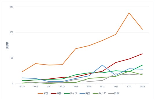 図3:自律実験に関連する研究論文の出版件数の国別年次推移(2015~2024年)