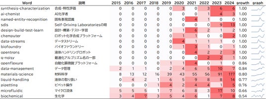 図4:自律実験に関わる論文概要に含まれる特徴的なキーワードの年次推移(2015~2024年)