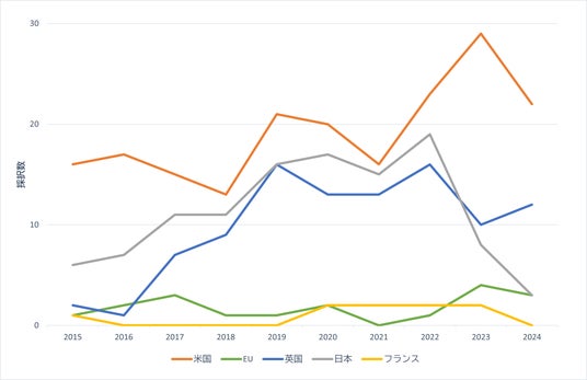 図1は、2015~2024年の期間における、自律実験に関連するグラント配賦額上位5か国のプロジェクト件数動向です。ただし、中国はグラントデータを非公開としており、実態を反映していない可能性が高いため除外しました。また、公開直後のグラント情報にはデータベースに格納されていないものもあり、直近の集計値については過小評価されている可能性があります。