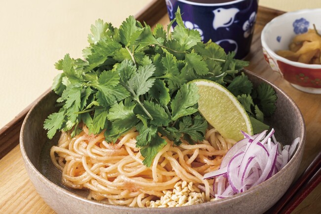 発酵バターとたっぷりのたらこを纏うもちもち食感のスパゲティに、相性の良いパクチーをたっぷりのせ、ナッツや玉ねぎで食感や味わいの変化を楽しんでいただきたいと考え誕生しました。