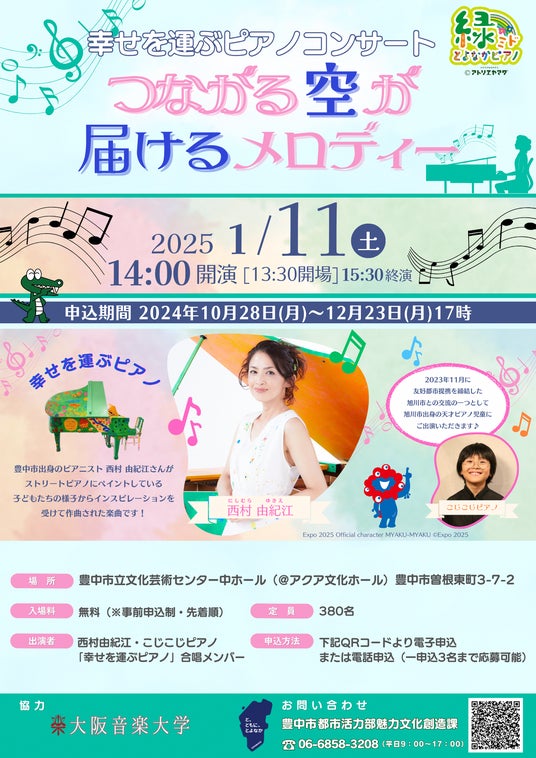 豊中市は、本市出身のピアニスト・西村由紀江さんと北海道旭川市出身のピアノ大好き小学3年生・こじこじピアノさんによるピアノコンサート「幸せを運ぶピアノコンサート ~つながる空が届けるメロディー~」を開催します。