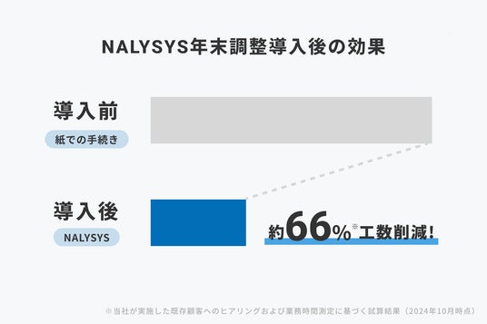 「NALYSYS 年末調整」は、申告依頼から情報入力や回収、内容チェックや計算補助、データ活用までの一連の業務をクラウド上で完結できます。従来の紙ベース運用と比べて、年末調整にかかる作業時間を最大66%削減可能です。(※1)