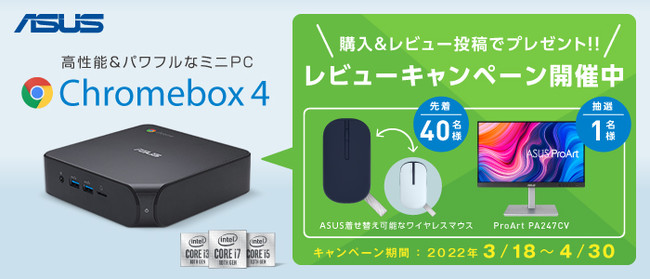 キャンペーン期間内にASUS Chromebox 4シリーズ ミニPCを購入・ECサイトにレビューを投稿した先着40名様に着せ替え可能なワイヤレスマウス、さらに抽選で1名様にモニター「ProArt PA247CV」をプレゼント!
