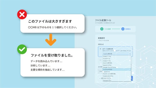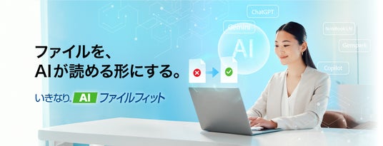 「いきなり AIファイルフィット」は、AIが読み込める形にファイルを自動変換するツールです。利用したい生成AIにあわせて、動画や音声、PDF、Officeファイルを変換、分割、圧縮し、AIに添付できるようにします。