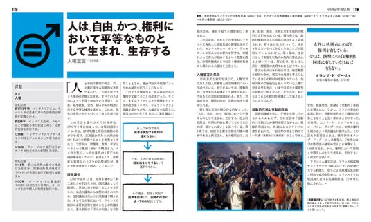 各項では、「法」を知る上で重要な思想や出来事を取り上げ、基本的に見開き単位で紹介していきます。取り上げられる法は、それを象徴するタイトルと「法」の名前を大見出しとし、まずは歴史的背景や施行後の社会がどう変わったのかを記載。本文にあたる部分では、法成立の経緯や法の内容について解説します。項によっては実際に起きた事件を例に、法の運用についても紹介しています。ほか、法制定の舞台を象徴する図版、ポイントをつかむための図表、思想家や政治家による金言など、理解を助ける多数の項目がカラフルに構成されており、図鑑としての分かりやすさも実現しています。