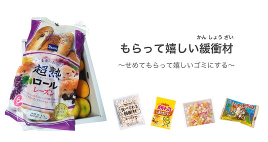 緩衝材を送る相手に合わせて、食べ物やお菓子、本などもらって嬉しい緩衝材を選ぶことで、「嬉しいごみ」にするというアイデア。