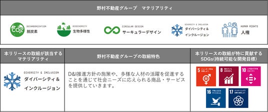 野村不動産グループでは、2030 年までに取り組むべき 5 つの重点課題(マテリアリティ)の一つに「ダイバーシティ&インクルージョン」を掲げ、2022年9月に「野村不動産グループ ダイバーシティ&インクルージョン推進方針」を策定しています。全てのグループ会社に所属する管理職向けの LGBTQ+研修、イントラネットを活用した定期的な社内啓発活動、人事部門の全担当者に向けたLGBTQ+相談窓口の研修等の取組みを通じ、LGBTQ+当事者を含む全ての従業員がいきいきと自分らしく安心して仕事に従事できるよう職場環境づくりに努めています。野村不動産を含むグループ6社では「パートナーシップ制度」を導入しており、「事実婚パートナーシップ」及び「同性パートナーシップ」関係を希望する社員も、法律婚と同様の処遇や福利厚生制度の利用を可能にしています※1。