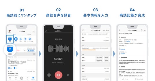 本機能は、商談時にビジネスデータベース「Sansan」のスマートフォンアプリを開いて録音を開始するだけで、商談中の会話を自動で文字起こしし、AIが要点を整理してコンタクトに商談記録として登録するものです。録音した音声は端末内で処理され、文字起こしと要約が完了すると自動的に削除されます。