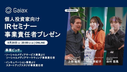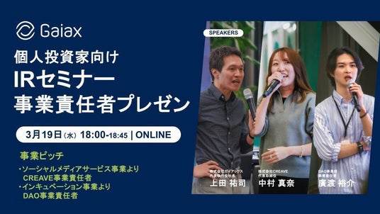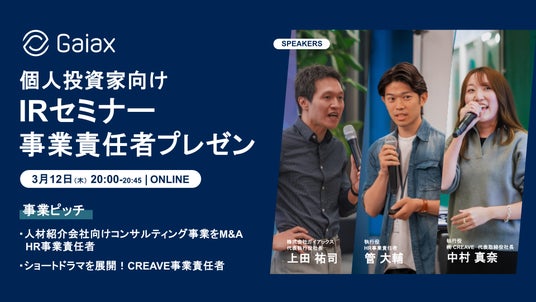 株式会社ガイアックス(本社:東京都千代田区、代表執行役社長:上田 祐司、証券コード:3775、以下 ガイアックス)は、「個人投資家向けIRセミナー 事業責任者プレゼン」を3月12日(木)に開催いたします。