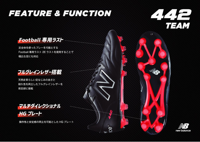 今回は442 PRO HGモデルと同時に、天然皮革らしい足なじみの良さと耐久性を両立したフルグレインレザーを前足部に搭載した442 TEAM HGや、その他442 Team TF(ターフシューズ)、442 Team ID(インドアシューズ)なども発売。今まで以上に履き心地が良くなった新しい442シリーズを是非お試しください。