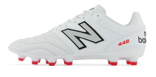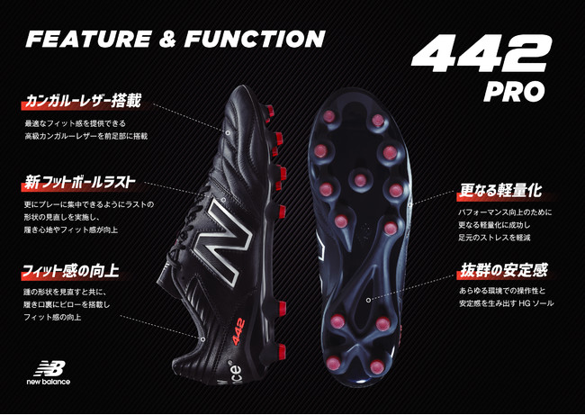 妥協することなく努力を続けるプレーヤーに向けて、人気の「442」をアップデート。足馴染みのよい前足部のカンガルーレザーアッパーはそのままに、指先から履き口、踵までトータルに履き心地を高めたプロラスト、大幅な軽量化に加え最適な剛性と安定性を満たすHGソールを新採用。よりシャープになったオーセンティックなシルエットのもと、最上のフィットを提供します。Dと2Eの2ウイズ展開です。ニューバランス公式オンラインストアストアおよびニューバランスオフィシャルストア、その他一部のニューバランス取り扱い店舗にて4月19日(火)17:00より予約開始、4月29日(金)より発売いたします。