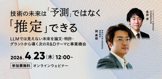 アスタミューゼ株式会社(本社:東京都千代田区、代表取締役社長:永井歩)は、2026年4月23日(木)12:00より、無料ウェビナー「技術の未来は「予測」ではなく「推定」できる ~LLMでは見えない未来を論文・特許・グラントから導く次のR&Dテーマと事業機会~」を開催します。第73回応用物理学会春季学術講演会での発表「TF-IDFによる物理学文献データベースの統計解析と研究動向の未来推定」をベースに、企業のR&Dや知財、新規事業開発のかた向けに再構成した内容です。