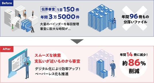 会計課が処理する支出伝票は年間で約3万5,000件にのぼり、1枚の伝票に複数の請求書を集約する場合もあるため、実際に受け取る請求書の件数はさらに多くなります。毎日約150枚近くの支出伝票に押印することが当たり前になっていました。伝票保管用のファイルは年間96冊必要で、保管スペースのひっ迫や、ファイルの中から必要な書類を探し出す手間も課題でした。