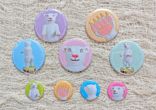 彦さんの「シロクマ 」をモチーフにしたオリジナル缶バッジを、7/19より発売します。デザインは大サイズ(300円)が5種類、小サイズ(200円)が4種類の合計9種類です。