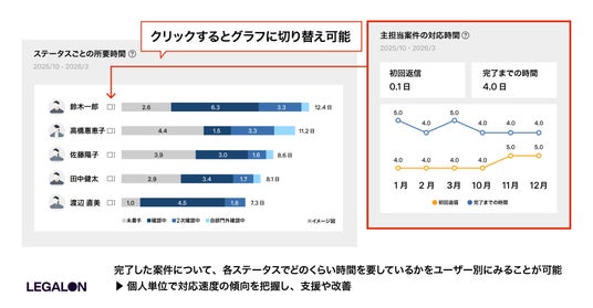 また、メンバーごとに、完了した担当案件の各ステータスの所要時間(中央値)を表示することができます。これにより、どの工程で時間を要しているのか、メンバーごとの対応傾向やボトルネックをより具体的に特定しやすくなります。法務組織の稼働状況の可視化に加え、案件対応プロセスの見直しや継続的な業務改善を支える基盤として、より一層活用の幅を広げていきます。