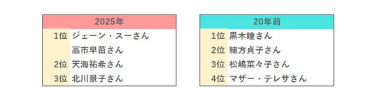 20年前は、1位「黒木瞳さん」、2位「緒方貞子さん」、3位「松嶋菜々子さん」、4位「マザー・テレサさん」でした。