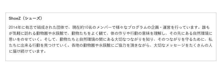 各イベント期間中、野生生物に関する保全教育プログラムを全国各地で実施する団体「ShoeZ(シューズ)」協力のもと、飼育スタッフによるペンギン・カワウソのイベントを実施。また、期間限定で「ShoeZ」によるエコグッズも販売しました。これらの取り組みで得られた売上は今年もShoeZを通して、ペンギン・カワウソそれぞれの保護活動に取り組む団体に寄付する予定です。