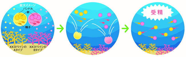 (※1)サンゴ産卵時には、卵と精子が詰まったバンドルが放出され、バンドルが割れて、中の卵と精子が水中へ飛び出てきます。別の親由来の卵と精子が受精します。