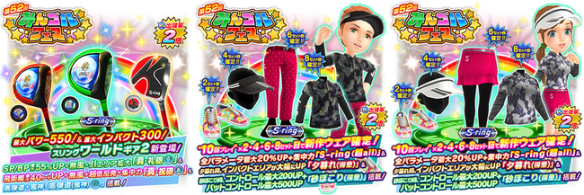 今回のギアガチャでは、S-ringシリーズより、最大パワー550かつ、最大インパクト300に加えアクティブスキル「真・礼砲」「真・祝砲」「高弾道(風神)」を搭載した「スリングワールドクラブ2」が登場いたします。ウェアガチャでは新パッシブスキル「S-ring(超all)」など、複数スキルを搭載した新作ウェアが登場。さらに「10回プレイ」2・4・6・8セット目で新作ウェアが確定となります。ぜひ、ご参加ください!