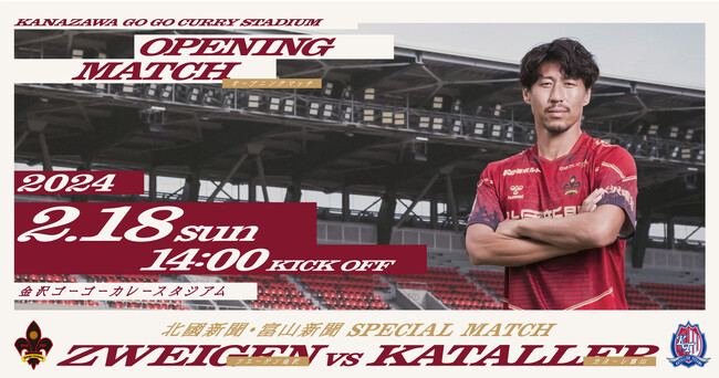 ツエーゲン金沢は、2024年から北陸に初めて誕生するJリーグ規格を満たすサッカー専用の「金沢ゴーゴーカレースタジアム」に本拠地を移して戦います。この完成披露の試合「オープニングマッチ」が、2月18日(日)vsカターレ富山と対戦することが決定しました。