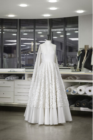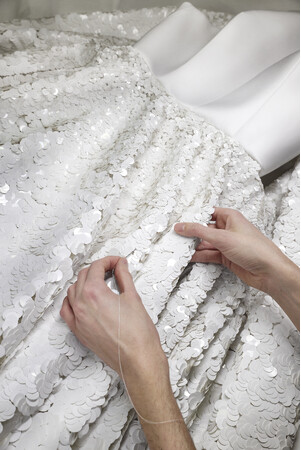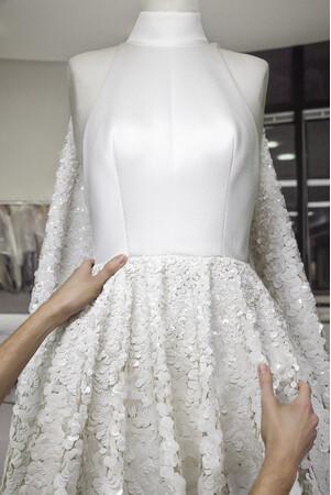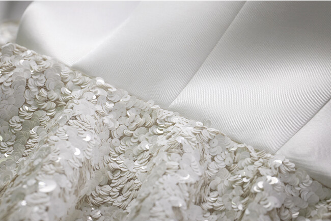 さまざまなサイズのマットで光沢のあるスパンコールが全体に刺繍された、ホルターネックドレスは、20,000個以上のスパンコールを刺繍し、約400 時間をかけて制作されました。