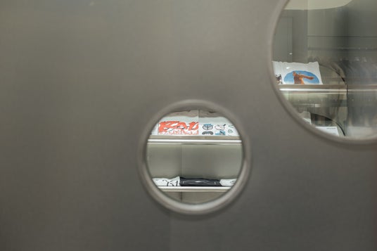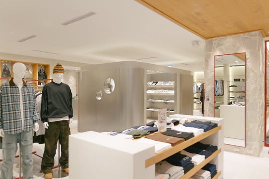 〈BEAMS T〉の独立コーナー、丸窓から見える囲いの内部にあるTシャツのレイアウト