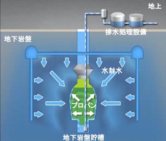倉敷基地は、石油ガス備蓄では本邦初となる水封式地下岩盤タンク方式を採用しています。国家石油備蓄ガスの受け入れは、2017年3月に完了、貯蔵容量約40万トンは、一つのタンクとしては世界最大規模となっています。倉敷国家石油ガス備蓄基地(JOGMECウェブサイト)