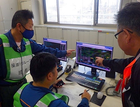 実施にあたっては、訓練従事者の役割分担の明確化を行うと共に、ウェアラブルカメラを活用して、監視操作システムモニター画面や訓練風景等を、倉敷基地とJOGMEC本部がオンタイムで共有し、より現実感のある訓練に努めました。