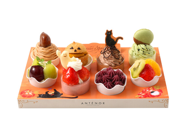 ハロウィンパーティーを盛り上げます! むらさき芋のモンブラン、苺ムース、かぼちゃのプティシュー、ショコラなど8つの味わいを詰め合わせました。